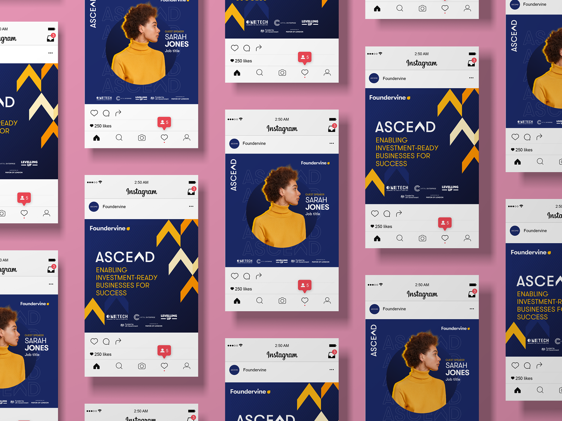 Ascend is a programme that aims to move businesses to the next level by introducing them to connections and opportunities. The brief was to create an adaptable vibrant brand that would evoke a sense of possibility and community. I used versatile elements that could be utilised across content to emphasise scaling and growth.